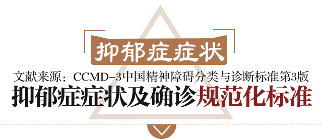 情绪持续一周以上异常心情压抑、郁闷、沮丧,对日常活动缺乏兴趣,对前途悲观失望,病前的精神创伤常盘踞在脑中,以致精神不振,脑力迟钝,患者为此感到羞愧和内疚。
