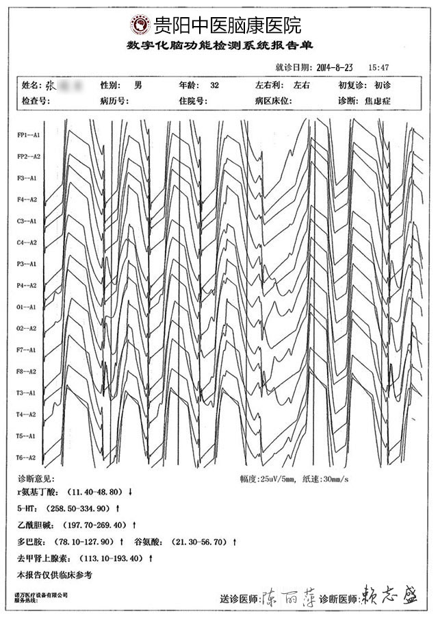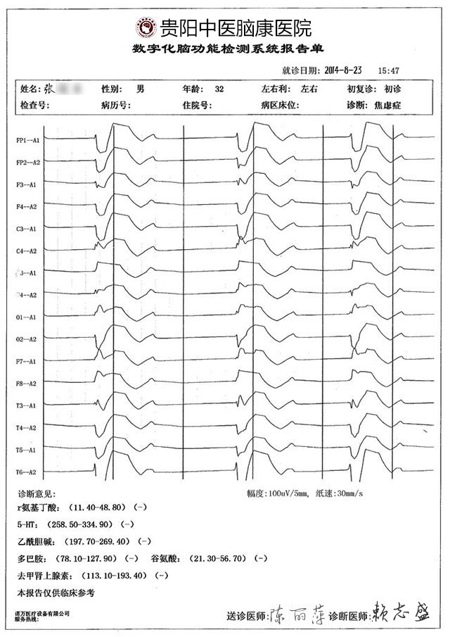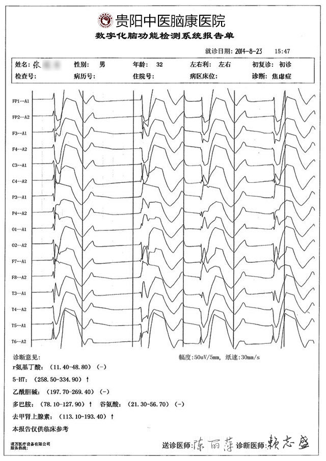 就诊经历:患病1年,因失恋长期情绪波动,导致Glu(谷氨酸)升高、多巴胺下降诱发急性焦虑症,治疗当天症状缓解,1疗程后彻底康复,愈后回访两次无复发迹象。